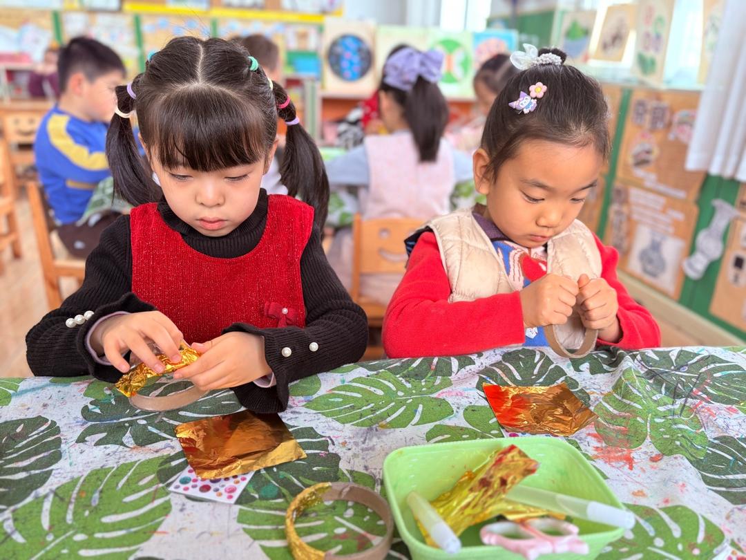纸质金镯制作环节,小朋友们沉浸式体验手工创作的乐趣。教师一步步示范折纸、卷边、粘贴、装饰的全过程,小朋友们紧跟节奏,小心翼翼地折叠卡纸、粘贴亮片、系上丝带,用心打磨每一处细节。完成制作后,小朋友们将金镯戴在手腕上,互相欣赏、彼此点赞,活动室里回荡着欢快的笑声。
