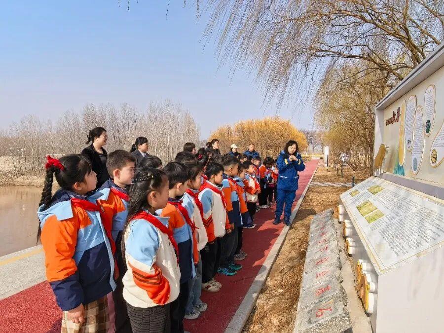 3月9日上午,东阿县黄河大堤上,一群戴着红领巾的孩子围成一圈,问题一个接一个。春风微凉,他们的脸蛋被吹得红扑扑的,眼睛却亮得很。他们是东阿县牛角店镇中心小学二(2)中队的少先队员们。他们不上语文课,也不上数学课,而是把课堂搬到了黄河边——一堂名为“保护母亲河,争做黄河小卫士”的实践活动课,就这样在黄河涛声中开讲。