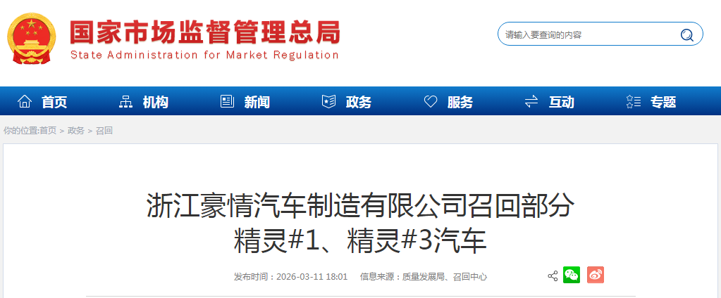 日前,浙江豪情汽车制造有限公司根据《缺陷汽车产品召回管理条例》和《缺陷汽车产品召回管理条例实施办法》的要求,向国家市场监督管理总局备案了召回计划。