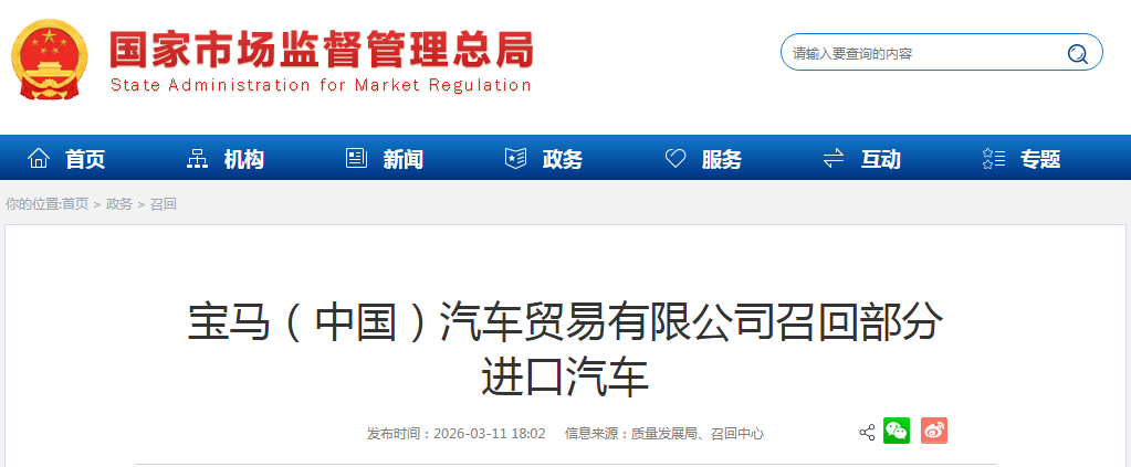 召回编号S2026M0027V:自2026年3月16日起,召回生产日期从2020年7月31日至2022年12月22日的部分进口宝马2系、4系、5系、6系、7系、X4、X5、X6、Z4系列汽车,共计147830辆。