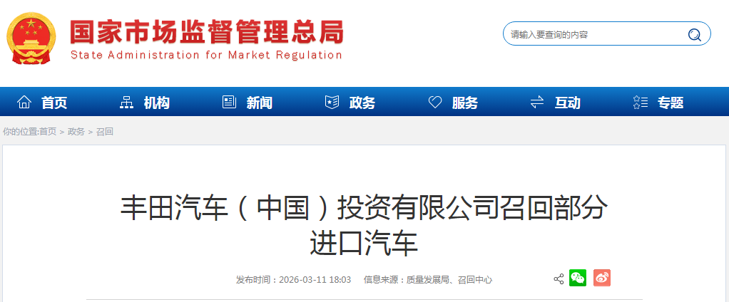 日前,丰田汽车(中国)投资有限公司根据《缺陷汽车产品召回管理条例》和《缺陷汽车产品召回管理条例实施办法》的要求,向国家市场监督管理总局备案了召回计划。