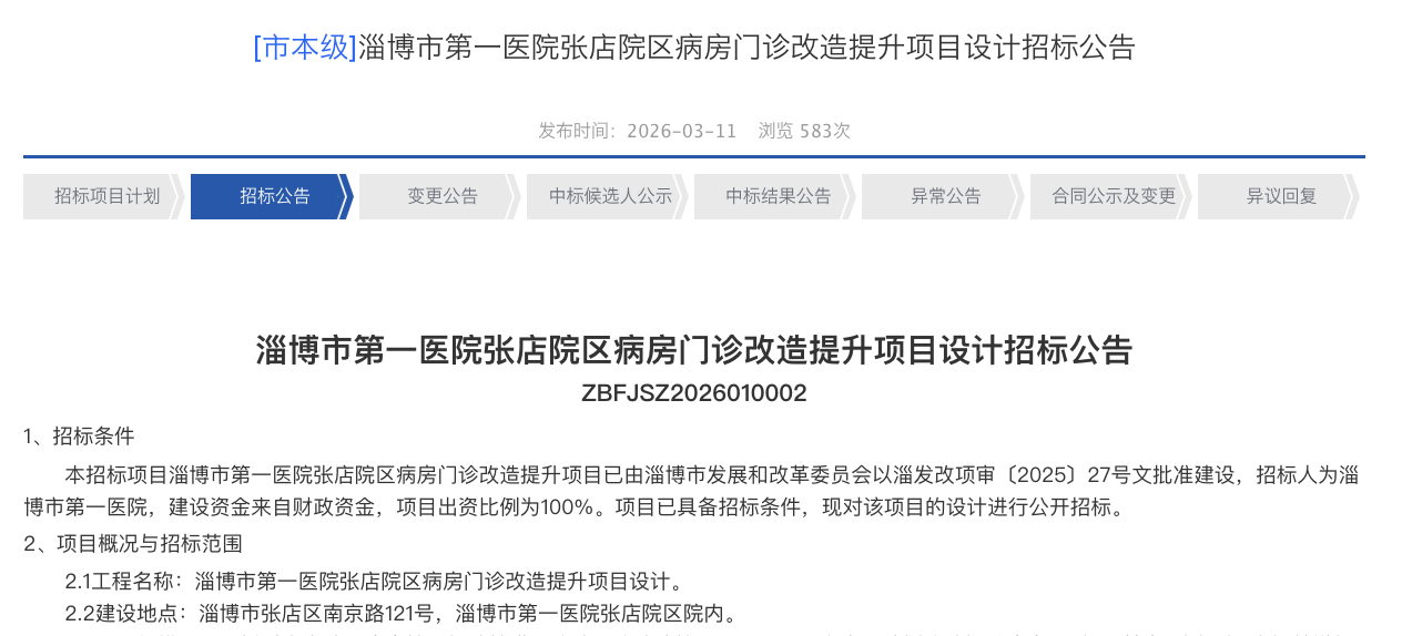 3月11日,淄博市公共资源交易网发布淄博市第一医院张店院区病房门诊改造提升项目设计招标公告。公告显示,该项目已获淄博市发展和改革委员会批准,建设地点位于张店区南京路121号院区内,拟对病房楼、门诊楼进行改造,总建筑面积44262平方米。