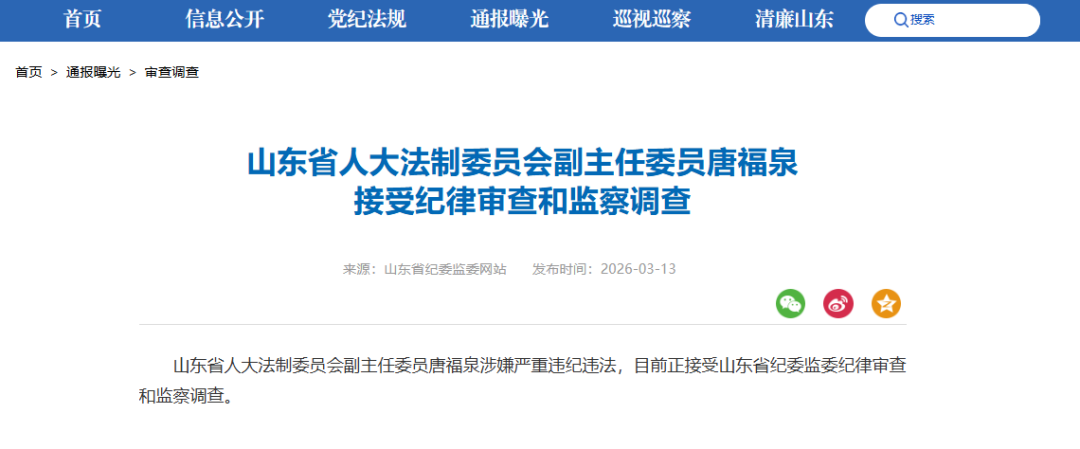 山东省人大法制委员会副主任委员唐福泉被查打虎拍蝇猎狐 | 2026-03-13 19:58:24 微信扫码扫码下载客户端山东省人大法制委员会副主任委员唐福泉涉嫌严重违纪违法,目前正接受山东省纪委监委纪律审查和监察调查。责任编辑:李金蔚