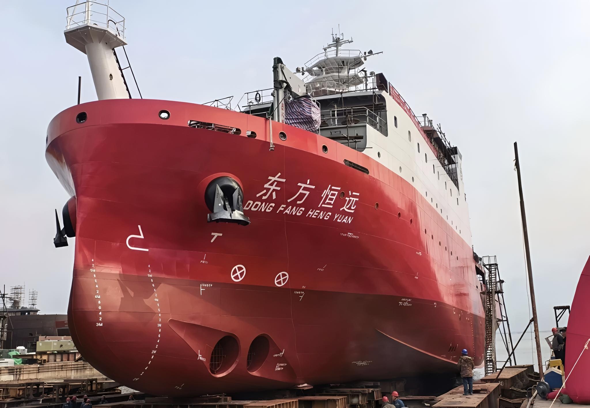 据悉,“东方恒远”号总长77米、型宽17.8米、型深7.6米、设计吃水4.0米、设计排水量3200吨、巡航航速15节、最大航速18节。船上设有指挥、通信网络、会议、气象海洋预报、声学设备舱、仪器存放等专用舱室。其顺利下水,标志着“东方恒远”号已完成总工程量70%,为今年6月交付使用奠定了重要基础。