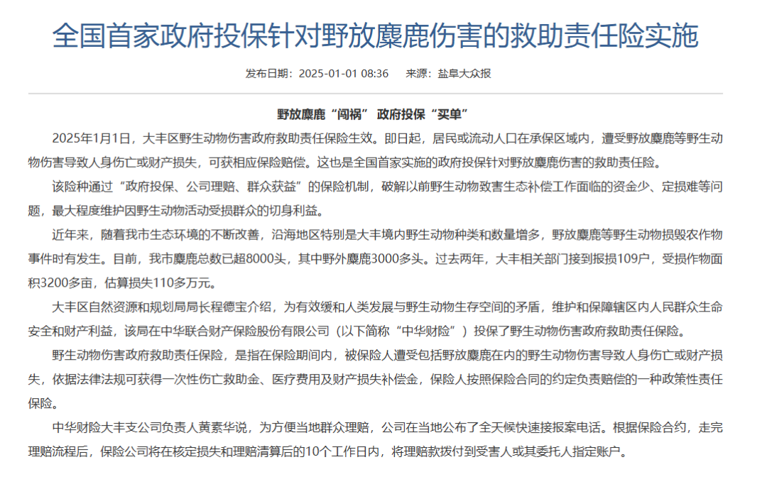 据悉,2025年,盐城市政府曾发布“全国首家政府投保针对野放麋鹿伤害的救助责任险实施”一文,政府投保为野放麋鹿“闯祸”进行“买单”。