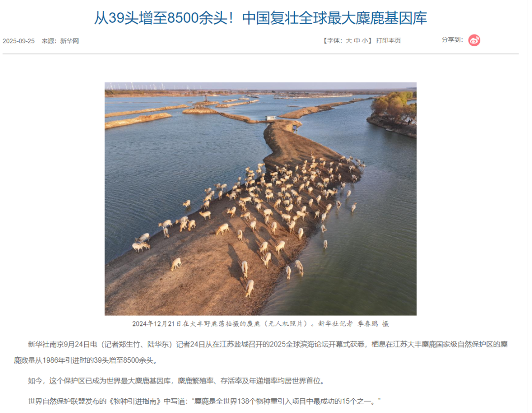 1986年,江苏大丰建立国家级麋鹿自然保护区,历经多年,2025年新华网数据显示,栖息在江苏大丰麋鹿国家级自然保护区的麋鹿数量从1986年引进时的39头增至8500余头。