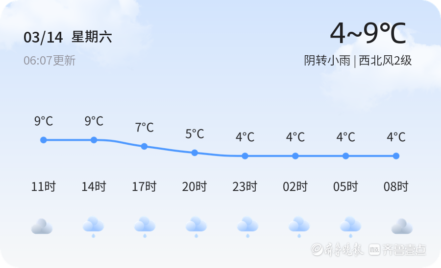 今日是2026年3月14日,农历正月廿六。菏泽市今日天气为阴转小雨,气温在4℃至9℃之间,西北风2级,空气湿度为62%,PM2.5指数为107。全市各区均出现阴转小雨天气,气温较为平稳,市民出行需注意携带雨具,谨防感冒。