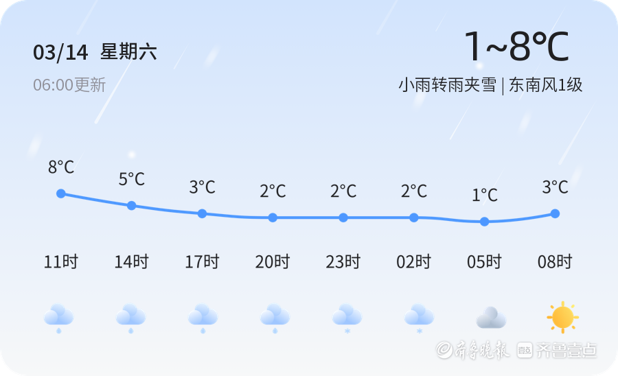 今天是3月14日,星期六,农历正月廿六。济南迎来小雨转雨夹雪天气,气温在1℃到8℃之间,东南风1级,空气湿度为58%。由于PM2.5浓度为140,空气质量处于中度污染水平,建议市民减少户外活动,特别是敏感人群应避免长时间暴露在室外。市民出行时需携带雨具,注意交通安全,防范道路湿滑带来的不便。 明天济南仍以小雨转雨夹雪天气为主,气温在2℃到8℃之间,北风风力3-4级。未来三天,济南天气以阴雨为主,气温波动不大,风力较大。市民需注意防寒保暖,尤其是早晚温差较大,应及时增添衣物。特殊天气情况下,建议减少不必要的外出,避免因天气原因造成不便。 温馨提示