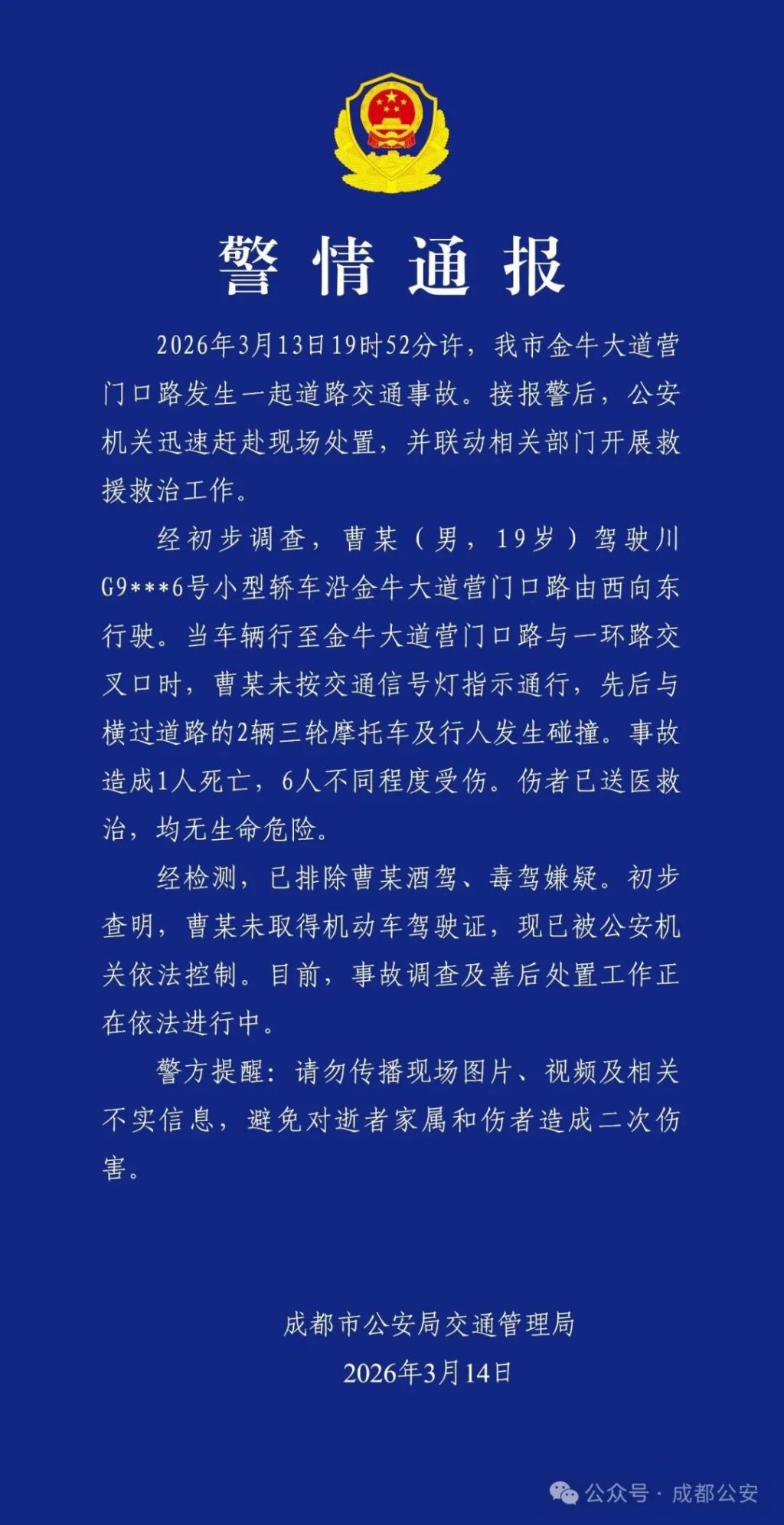 2026年3月14日,成都市公安局交通管理局发布警情通报:(“成都公安”微信公号)