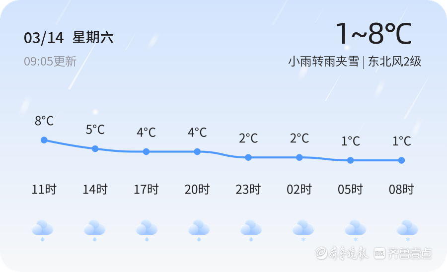 今日是3月14日,星期六,农历正月廿六。聊城市迎来小雨转雨夹雪天气,气温较低,最高气温8℃,最低气温1℃。东北风2级,空气湿度81%,PM2.5指数为233,属于重度污染,建议市民减少户外活动,出行时佩戴口罩,注意保暖。今天上午气温较为适宜,但下午气温逐渐下降,市民出行时请注意携带雨具,防范雨雪天气带来的不便。