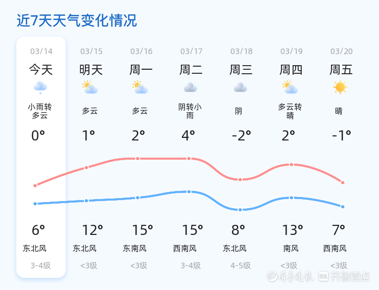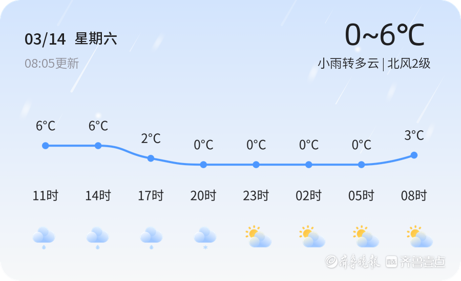今天是3月14日,星期六,农历正月廿六。滨州今日天气为小雨转多云,气温在0°C至6°C之间,北风2级。目前全市大部分地区已出现降雨,气温较低,市民出行请注意防寒保暖。