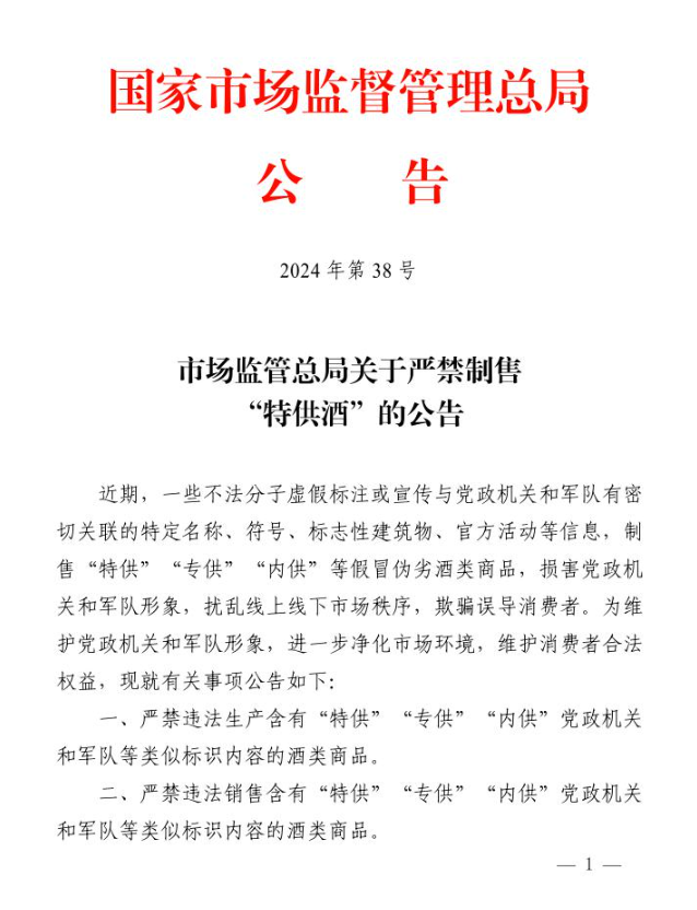 2022年7月,中央军委后勤保障部等六部门联合发布《关于禁止销售“军”字号烟酒等商品的通告》。2024年9月,国家市场监管总局印发《关于严禁制售“特供酒”的公告》,严禁违法生产、销售含有“特供”“专供”“内供”党政机关和军队等类似标识内容的酒类商品。