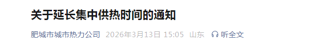 3月13日,肥城市城市热力有限公司发布关于延长集中供热时间的通知。