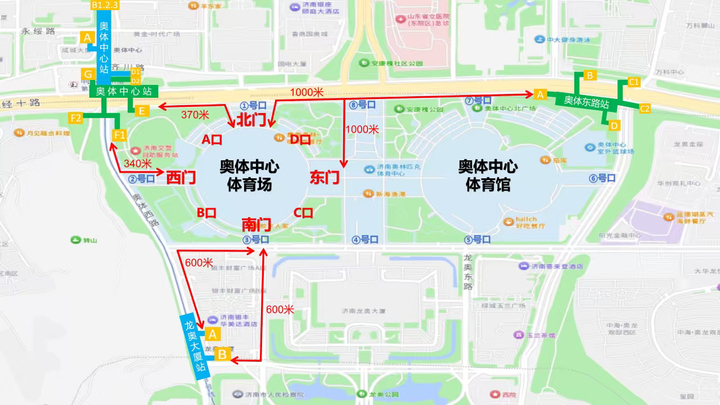 骑行非机动车出行的球迷朋友,可以停放在经十路北侧、奥体西路西侧、龙奥北路南侧非机动车停车泊位,奥体中心1、2、3号门疏散区域禁止停放。