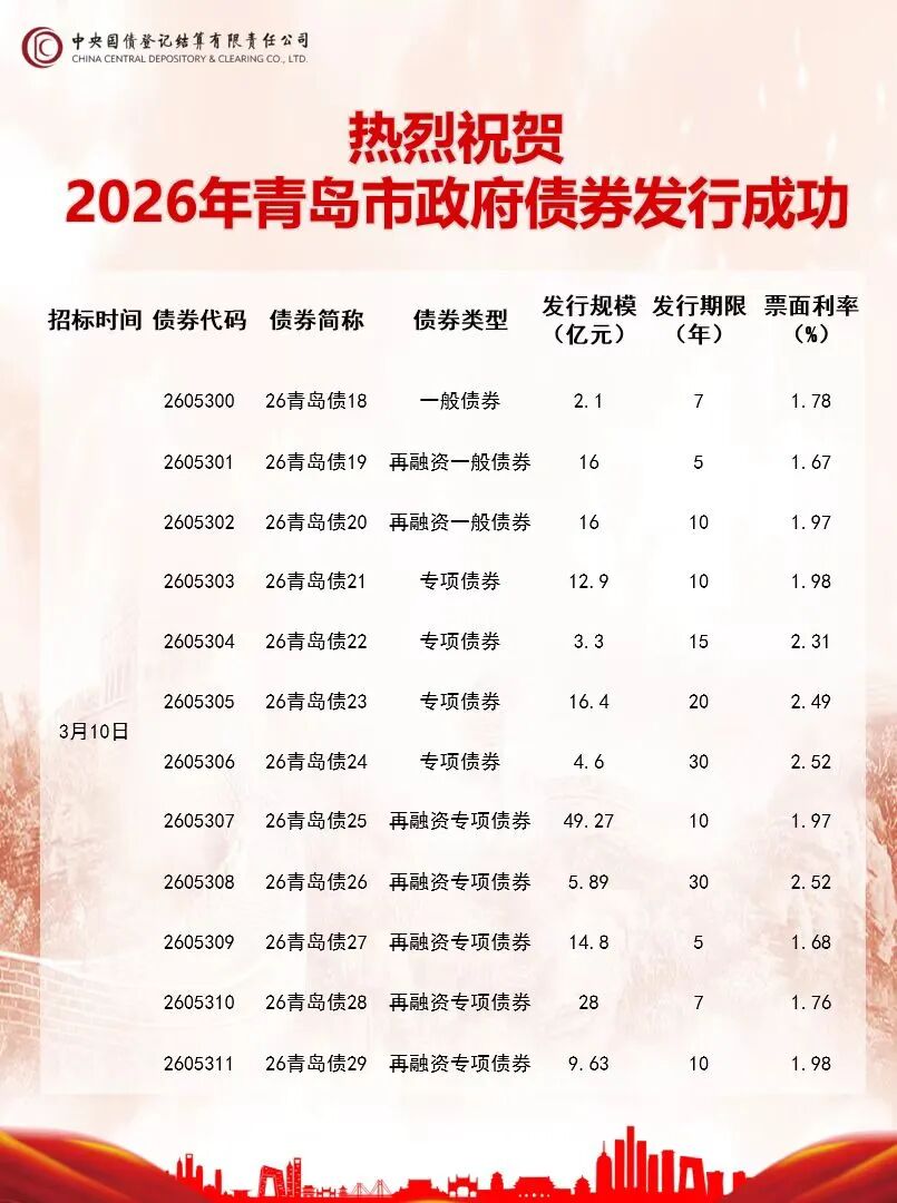观海新闻记者自市财政局获悉,3月10日下午,青岛在中央结算公司成功发行2026年第四批地方政府债券178.89亿元。