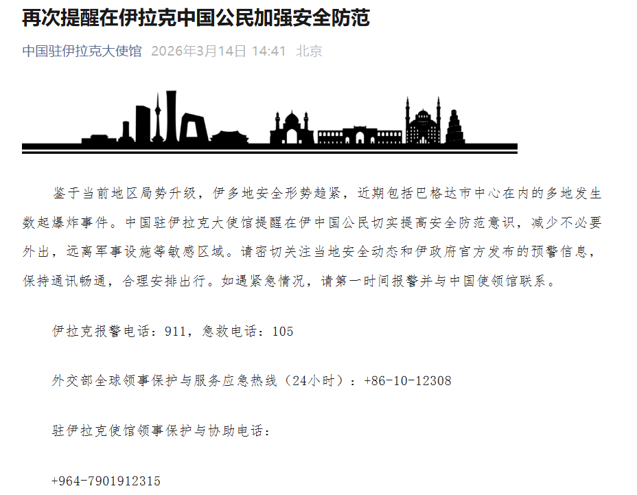 综合中国驻伊拉克大使馆、央视新闻 2026-03-14 15:13:34