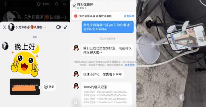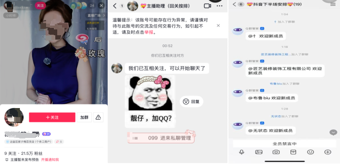 为进一步验证此类直播间的套路模式,记者在名为“苏苏”的直播间赠送了礼物“玫瑰”,随后主播提示“出去转转”,暗指退出直播间等待对方添加好友。不久后,名为“主播助理(回关安排)”的另一账号发来关注申请,记者关注后对方发来QQ群号。