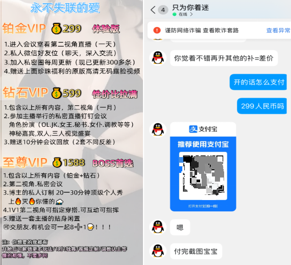 当记者询问是否还有其他“福利”时,对方会主动发来进阶套餐价目表,包括价值299元的铂金VIP、599元的钻石VIP以及1588元的至尊VIP及对应内容。