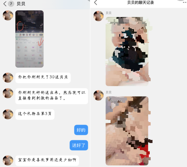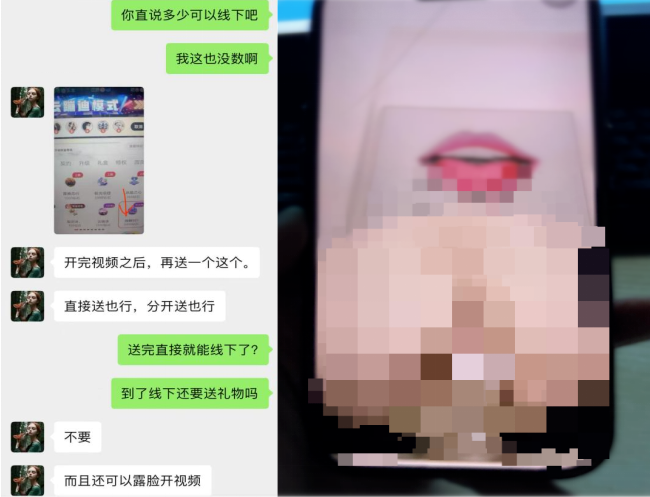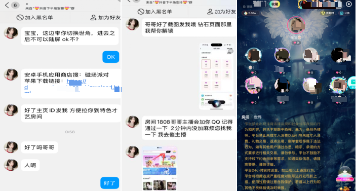 综合上述图文、视频材料和聊天记录,可以明确的是,女主播们在抖音等公共平台直播,通过直播间特定礼物与暗语将观众引入QQ群、特定App等私域空间,随后利用各种私密视频、一对一视频通话、线下见面、上门服务等方式,诱导用户充值“升舱”“解锁”,一步步完成收割。
