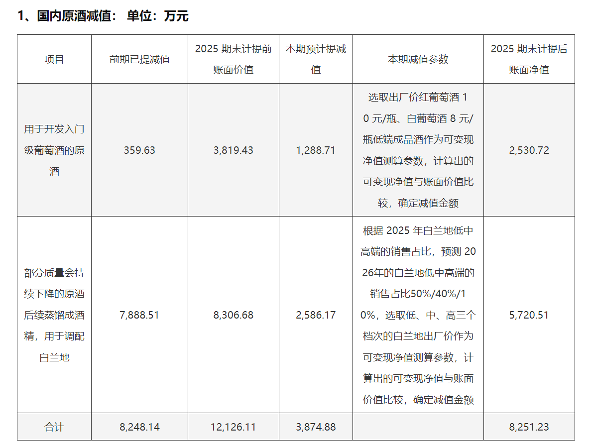 威龙股份表示,本次计提资产减值准备的资产是国内储存的原酒。2025年公司葡萄酒销量下滑,考虑国内葡萄酒市场销售持续下滑的形势,出于谨慎性原则,2025年末公司对国内储存的原酒进行了梳理,决议针对部分质量会持续下降的原酒,为延长保存时间,规划蒸馏成酒精储存,后续用于调配白兰地进行生产销售;针对之前归类在灌装后葡萄酒出厂价20元/瓶左右的部分原酒,2026年规划面向年轻群体和三四线城市及农村宴席市场,开发入门级葡萄酒,提高威龙葡萄酒市场占有率,加速资金回笼。根据此需求,公司对相关原酒进行减值测试,初步测试结果为预计减值额3875万元。实际金额将以会计师事务所审定的数据为准。