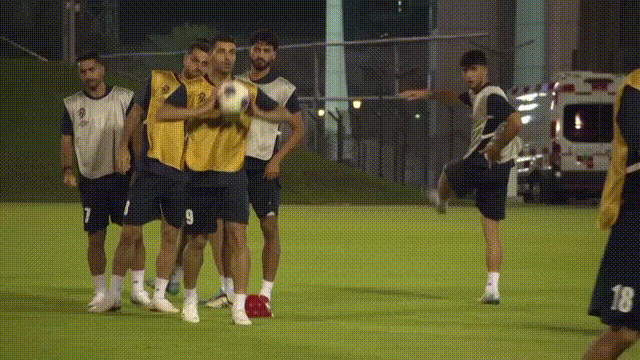 伊朗国家足球队前锋迈赫迪·塔雷米(9号球衣)与队友进行传接球训练。伊朗体育部部长艾哈迈德·多尼亚马利近日表示,鉴于美国和以色列对伊朗的军事袭击,伊朗队没有任何条件参加世界杯。多方消息称,目前尚不清楚这是否是伊朗的最终决定。