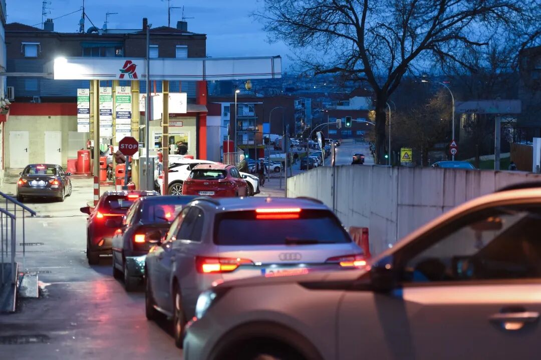 3月9日,车辆在西班牙首都马德里一处加油站排队加油。新华社发(古斯塔沃·巴连特摄)