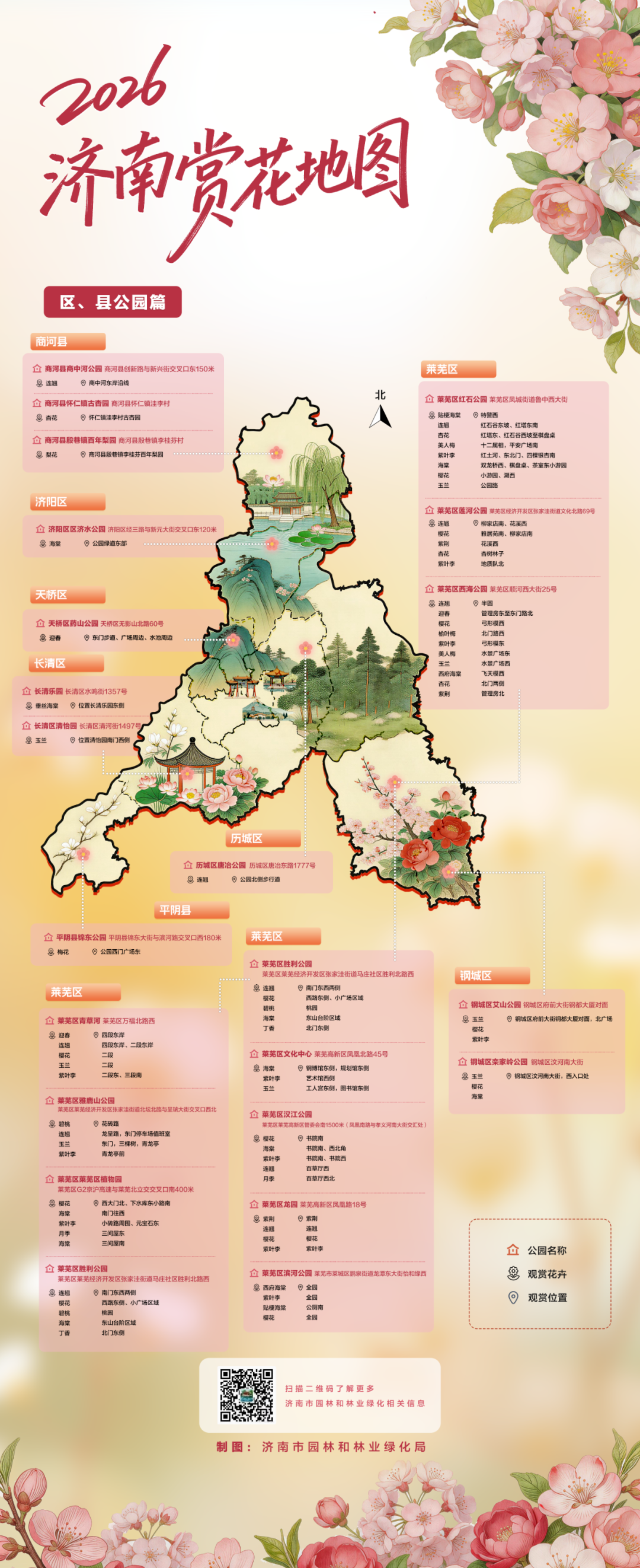 除此之外,济南市园林和林业绿化局还特别发布了2026济南赏花地图——区、县公园篇,带你寻找附近的赏花地,在家门口感受春日浪漫。