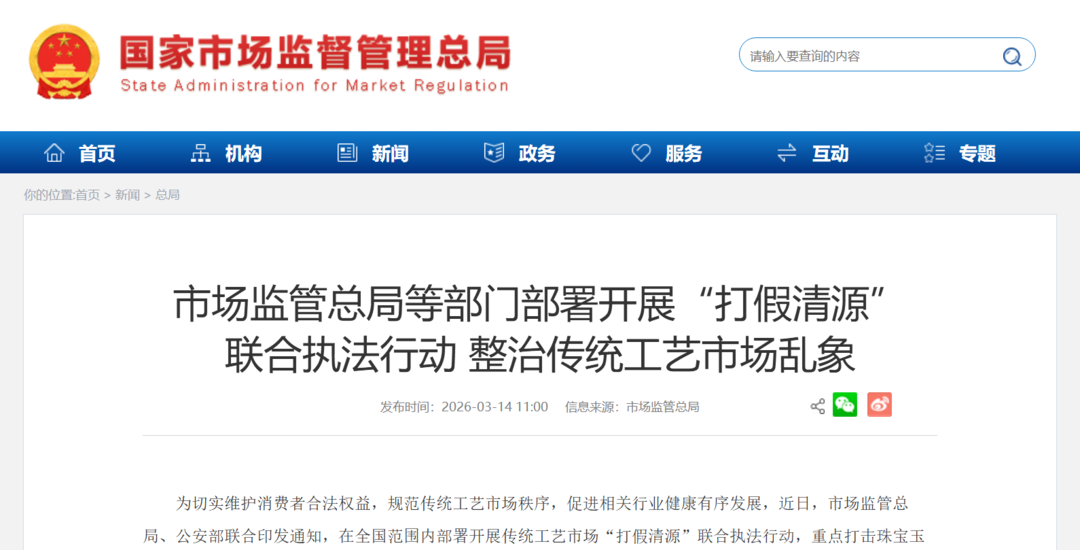 3月14日,记者在国家市场监督管理总局官网获悉,市场监管总局、公安部联合印发通知,在全国范围内部署开展传统工艺市场“打假清源”联合执法行动,重点打击珠宝玉石、贵金属饰品、红木制品等领域“假证书、假机构、假产品、假网站”等突出问题。
