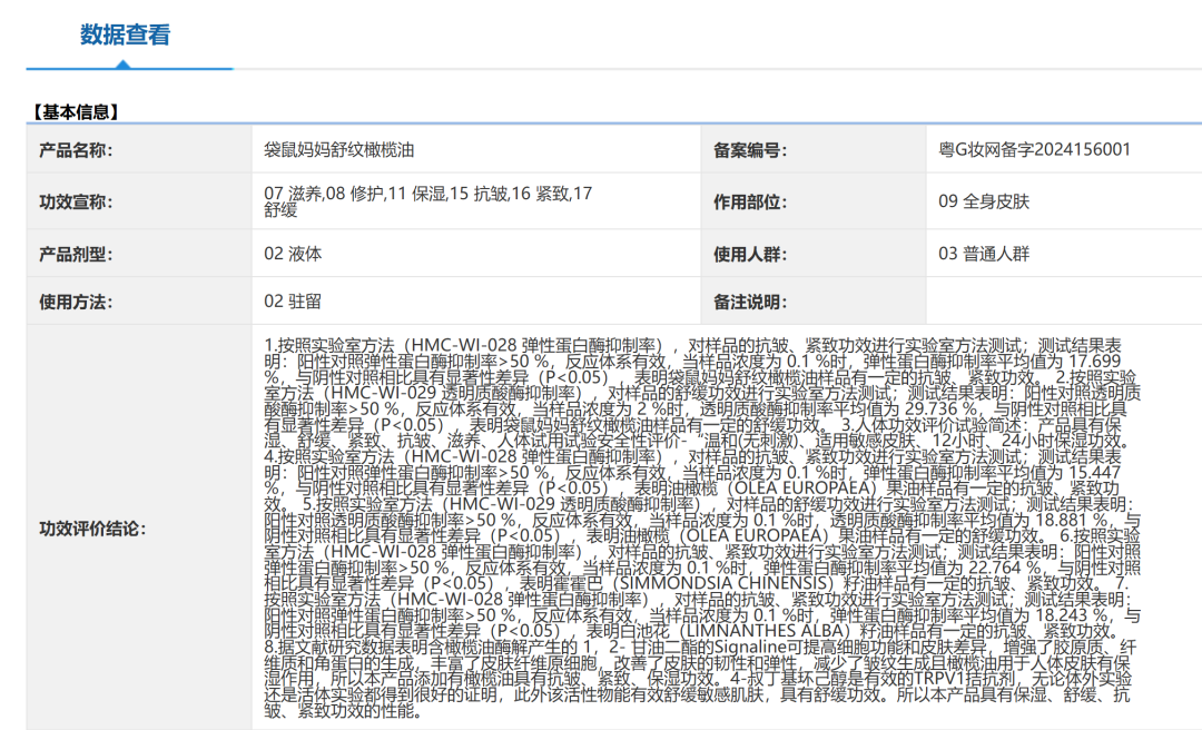 然而,当记者登录国家药品监督管理局国产特殊化妆品注册信息查询界面却发现,无论是企业新名称“广东袋鼠妈妈集团有限公司”,还是旧名称“广州天然国度生物科技有限公司”,其已批准的特殊化妆品注册信息中,均未涉及“孕妇和哺乳期妇女适用”的宣传。而在国产普通化妆品备案信息查询页面,那些在直播间被反复推荐的“袋鼠妈妈小麦礼盒”系列产品,包括柔肤水、保湿乳、沐浴露等,备案编号均明确显示为国产普通化妆品,使用人群一栏清一色标注为“03普通人群”,并无任何“孕妇”“备孕人群”相关标注。