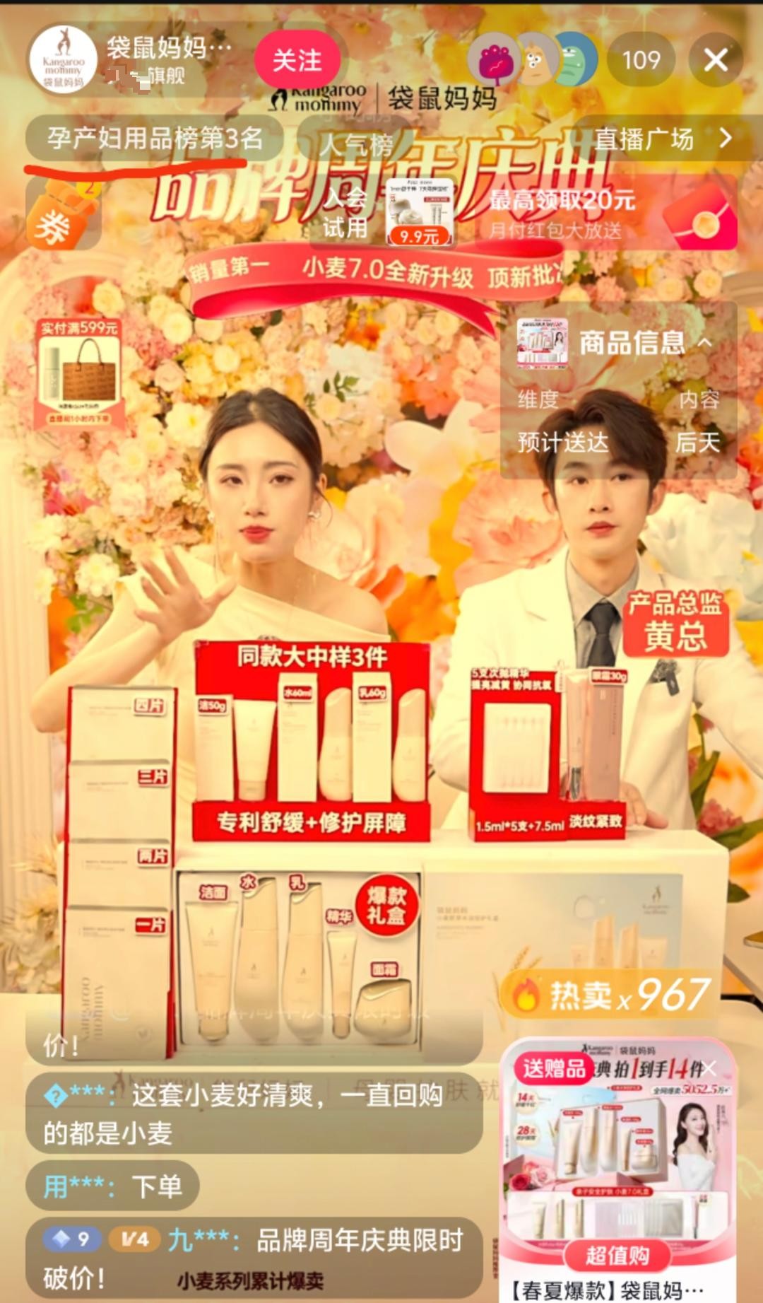 “怀孕期、备孕期、产后期、哺乳期、没有怀孕的都可以用。”“孕妈妈专用专研的。”“适合在孕期里面的新手妈妈去选择的入门级的护肤产品。”——这是《生活帮》记者在长达一个月的时间里,于“袋鼠妈妈”多个网购平台官方旗舰店直播间及宣传视频中看到的场景。