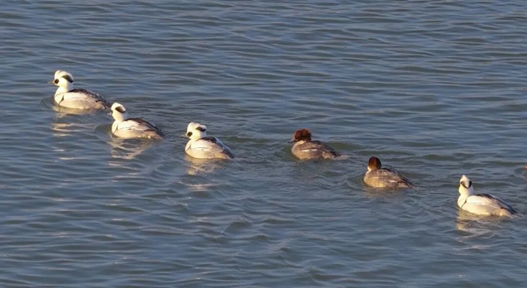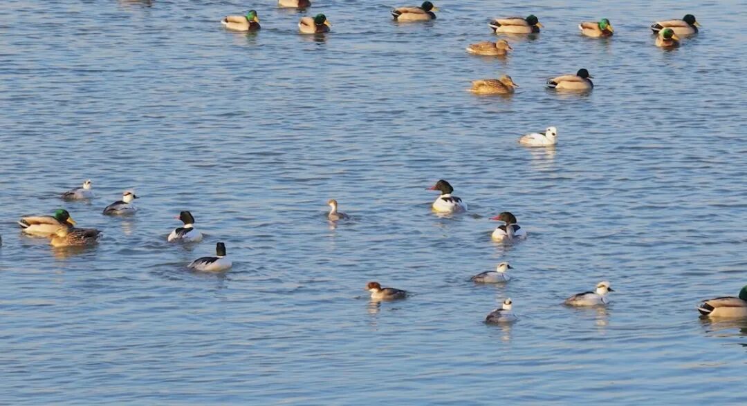 近日,在位于南海新区的威海五垒岛湾国家湿地公园,摄影爱好者拍摄到国家一级保护动物世界极危物种青头潜鸭、国家二级保护动物斑头秋沙鸭在此栖息觅食的身影。这是南海新区首次发现这两种鸟儿,这群对生态环境极为挑剔的“生态检验师”以灵动身姿为南海新区优良生态写下生动注脚。