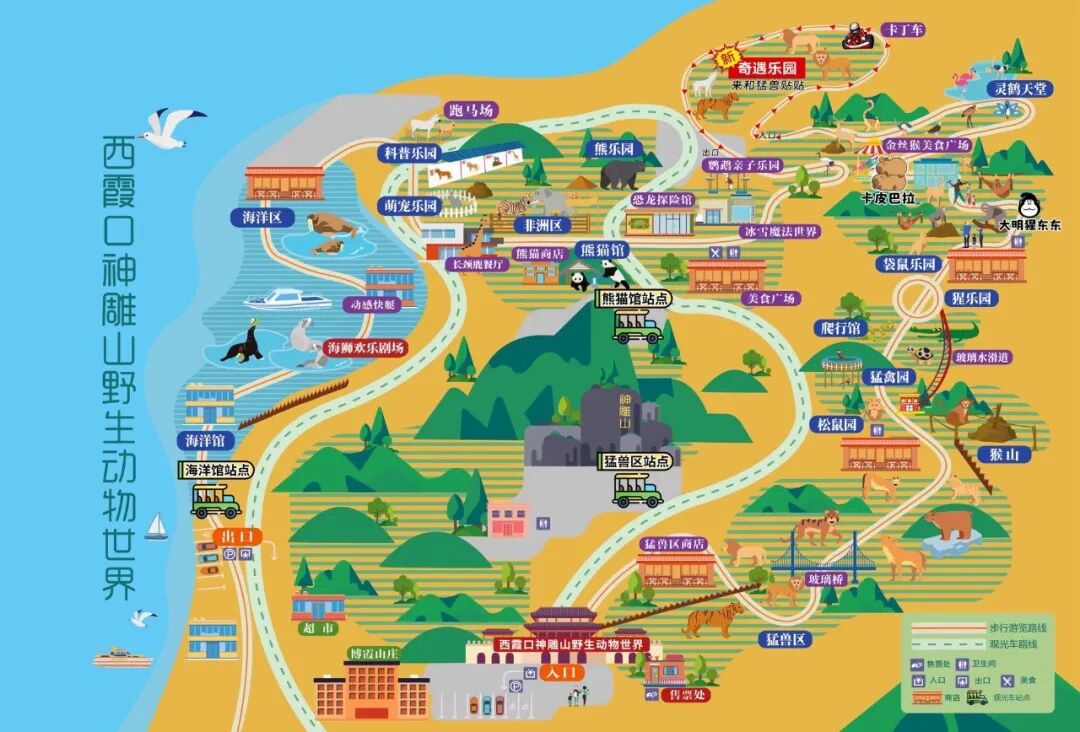 依托位置优势,西霞口神雕山野生动物世界的海洋动物始终浸润在大海中。这里的海洋区与大海相通,游览通道建设在海岸线上,涨潮时,海浪拍打着通道底部,带来了来自海洋的滋养。在这里,你既能欣赏到海豹在大海中欢快嬉戏,又能看到海狮在岸边慵懒地晒太阳,聆听海洋精灵的歌唱,还可近距离观看“海鸥刺客”与海狮、海豹上演小鱼争夺战。