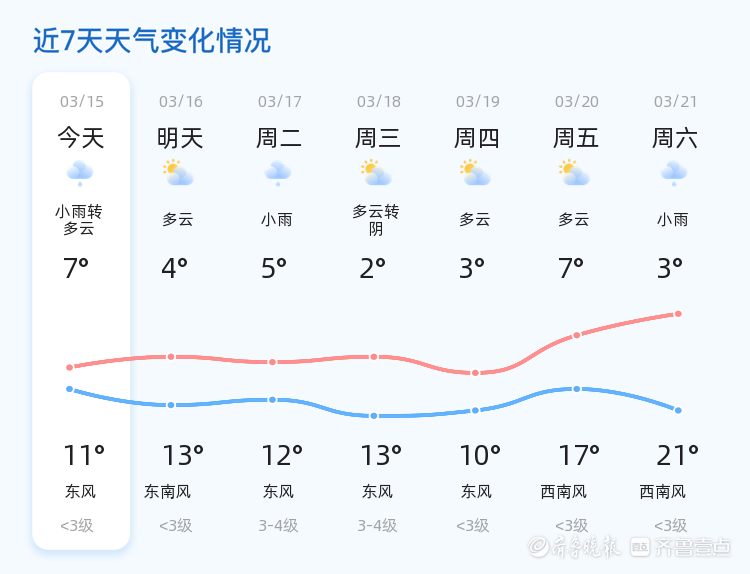 未来三天(3月17日至19日),枣庄市天气将以小雨、多云为主,气温波动较大。周三(17日)有小雨天气,气温在5℃至12℃之间,风力较大,东风3-4级;周四(18日)多云转阴,气温2℃至13℃,风力维持在3-4级;周五(19日)多云,气温回升至3℃至10℃,风力减弱。建议市民根据天气变化及时增减衣物,特别是周三的降雨天气,出行请注意携带雨具,防范道路湿滑。