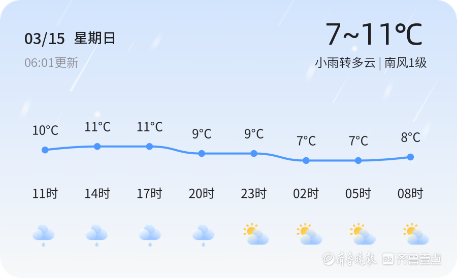 今天是3月15日,正月廿七,枣庄市迎来了一天的小雨转多云天气。早晨6点气温为7.5℃,预计今天最高气温为11℃,最低气温为7℃。全市各区县天气情况基本一致,均为小雨转多云,南风1级,空气湿度较高,达到87%,PM2.5指数为145,空气质量良。市民朋友们在出行时请注意携带雨具,防范降雨带来的不便。