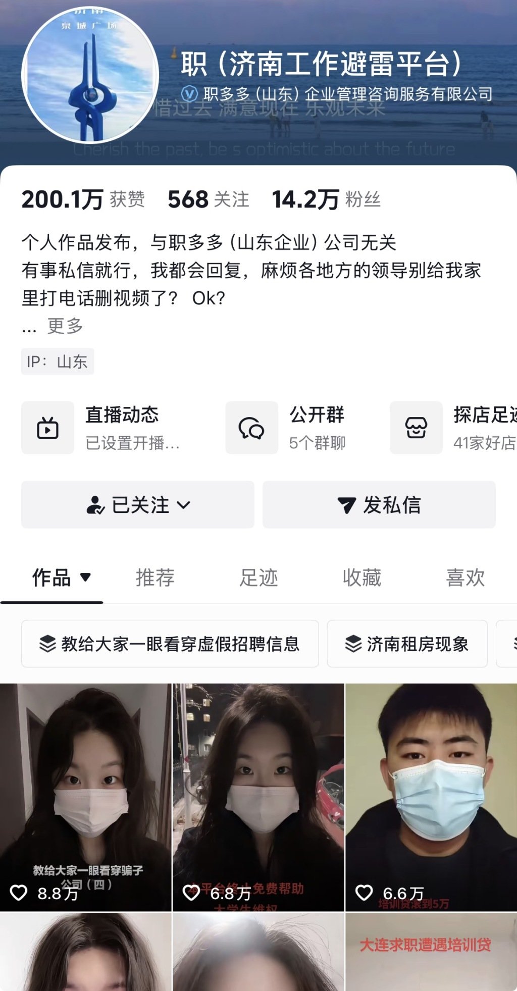 恰逢自媒体快速发展,范宜鹏顺势创建求职避雷自媒体账号,决心做一个敢于 “揭盖子” 的人。“我要做工作避雷账号,专做培训贷揭秘,把他们的套路全讲透,让受骗者有发声渠道,让更多人看清骗局。” 他说。从最初摸着石头过河、账号无人问津,到如今抖音账号 @职(济南工作避雷平台)粉丝破14万,全国各地的受骗者纷纷投稿分享经历,他的账号成了职场新人避坑的重要参考。