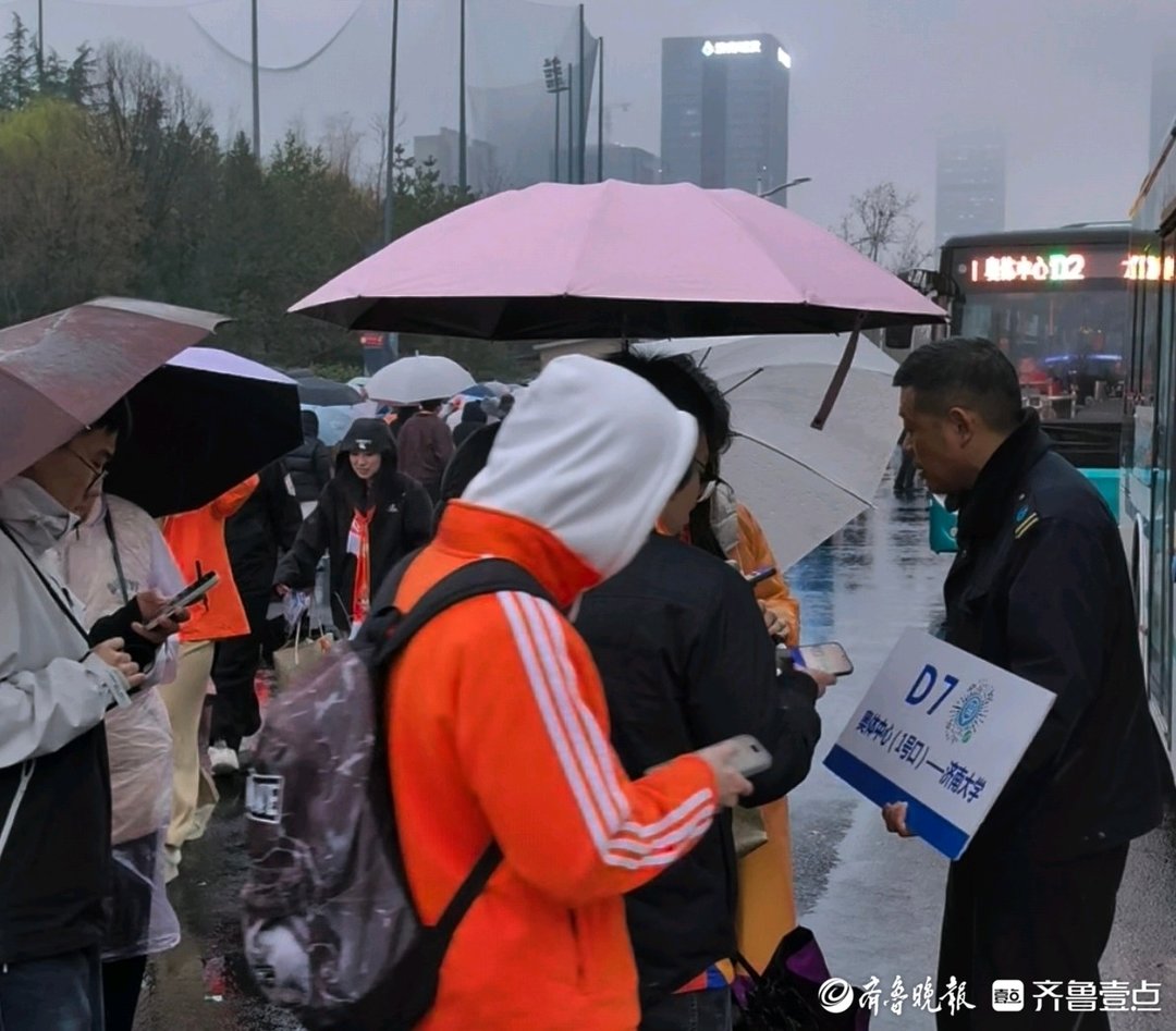 在D7路接驳现场,济南公交干线分公司七队工作人员冒雨值守,在站点周边引导球迷有序乘车。面对降雨天气,工作人员及时疏导客流、解答线路咨询,提醒乘客注意安全。