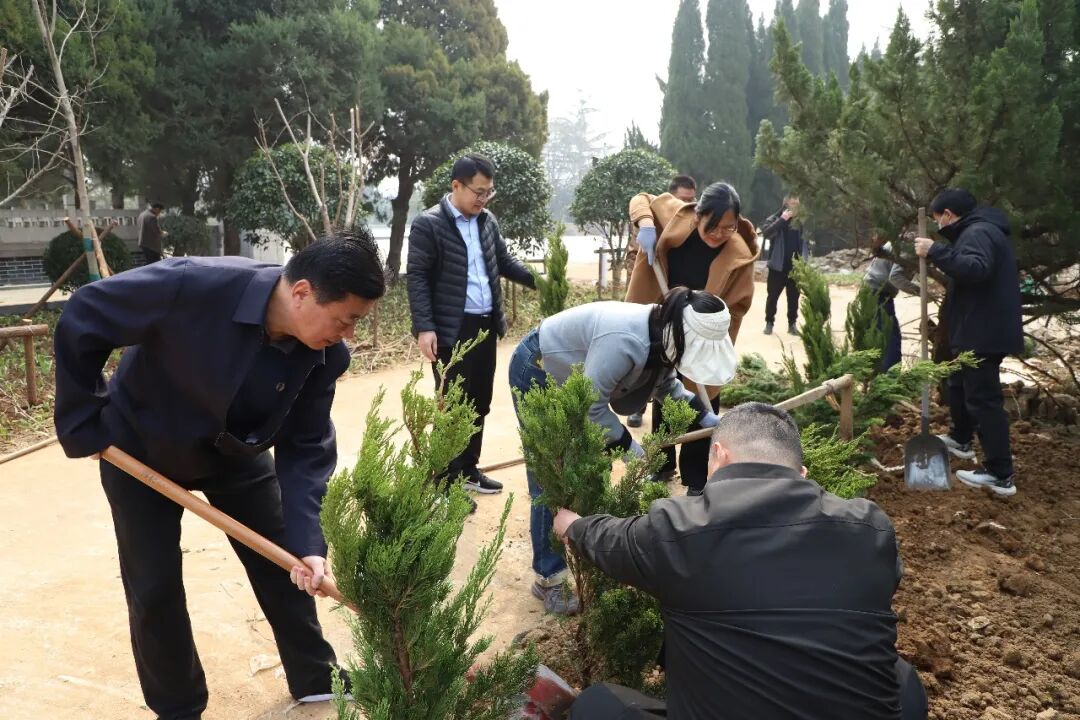 植树烈士陵园,在劳动实践中锤炼担当。在庄严肃穆的枣庄市革命烈士陵园,一场以“缅怀先烈·植树添绿”为主题的义务植树活动热火朝天地展开。在于建水的带领下,市、区两级党员干部们手持铁锹、水桶等工具,分工协作,默契配合。挥锹铲土、扶苗填坑、踏土夯苗、提水浇灌……每一个环节都一丝不苟,现场呈现出一派忙碌有序的劳动景象。大家以实际行动为安葬烈士的红色热土增添新绿,用汗水和热情践行“绿水青山就是金山银山”的发展理念。挺拔的树苗错落有致,在春风中轻轻摇曳,仿佛在向长眠于此的英雄们致敬,让红色基因与绿色发展在这片神圣的土地上交相辉映。党员干部在劳动中锤炼了党性、强化了宗旨意识,进一步坚定了为民服务的初心。