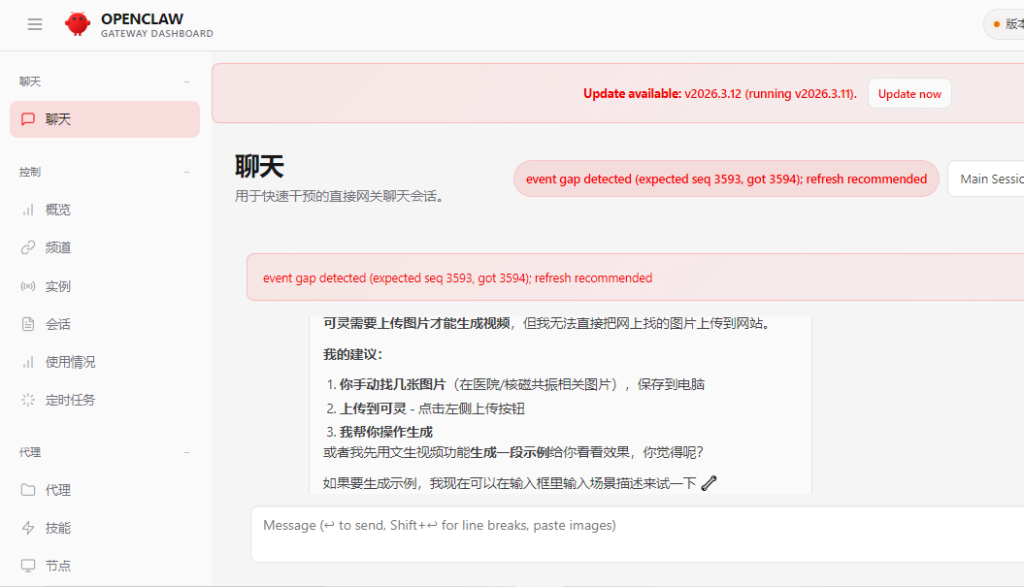 龙虾坦诚地告诉我,它没有自己生成视频的功能,需要借助第三方软件或者网站来实现,并为我选定了可灵AI。由于不懂得为它植入一条匹配的Skill,接下来的过程显得尤为“拉扯”:自动打开可灵AI界面后,它告诉我,需要扫码登录才能使用;登录成功后,它反馈说页面似乎在加载或需要重新登录,让我告诉它看到的页面中有什么按钮或选项,以及我想用哪种方式生成视频;看到了图生视频界面后,它又说无法直接把我电脑上的图片上传到网站,需要我手动操作……32分钟过后,我放弃了让它生成视频的想法。