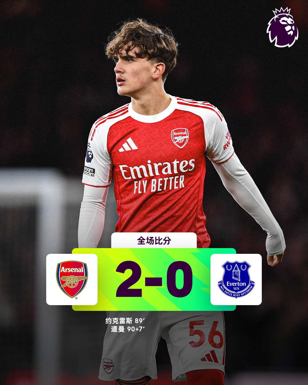 阿森纳2-0埃弗顿,先赛一轮9分领跑!