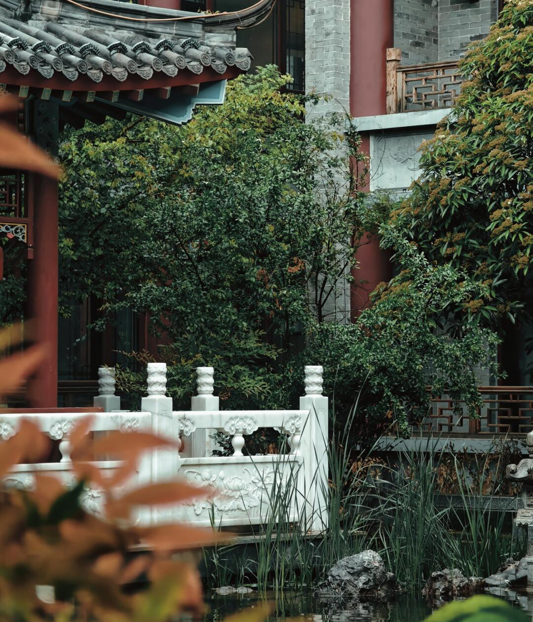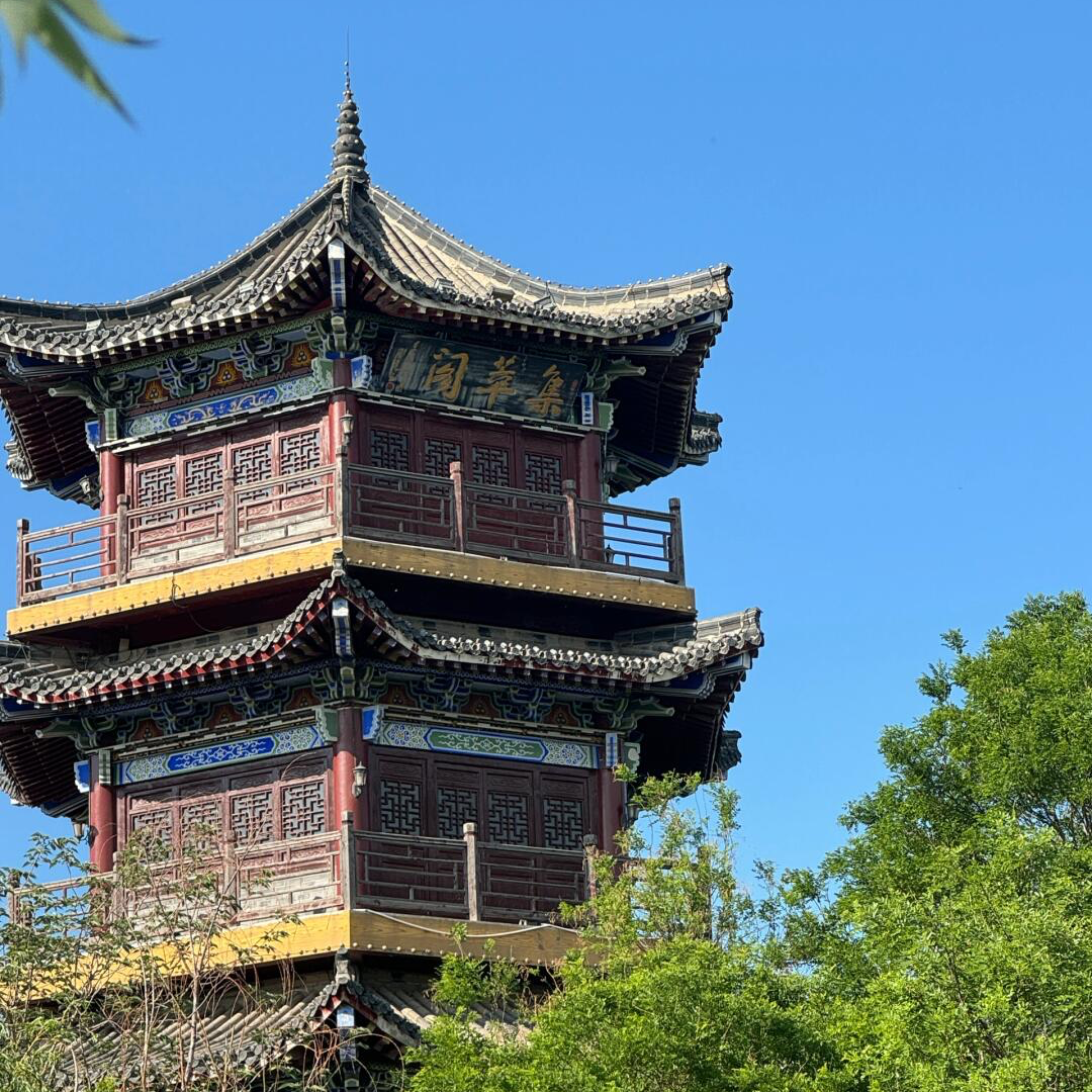 雨后古楼里的屋檐,朱柱更艳,青瓦愈翠,斗拱飞檐间还挂着未干透的水。灰砖墙的冷调与红雕花木窗的暖相对照,带着老聊城独有的厚重与雅致。