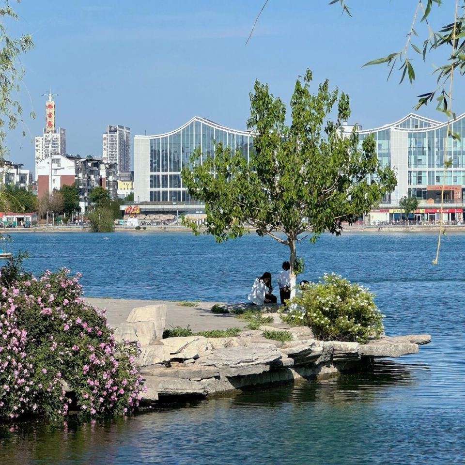 名人岛两岸垂柳如烟,刚刚抽出的新芽在湖水倒影里泛着鹅黄色的光。柳色与水面相接处,偶见一树一树的杏花斜逸而出,形成了“城中有水、水中有城、城水一体”的优美意境。
