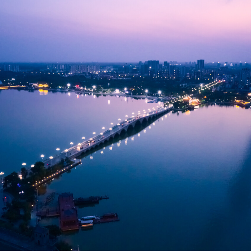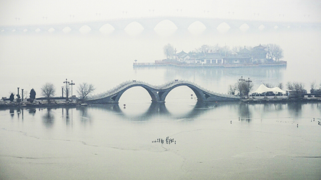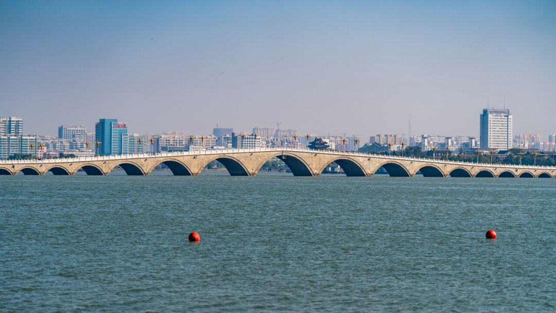远处的21孔桥更像一条卧在烟波里的白玉长龙,将古城的古韵与湖水的温柔紧紧相连。雨后的桥身被洗得洁净,像一串被湖水串起的玉璧,光影在洞间流转,随波纹轻轻晃动。