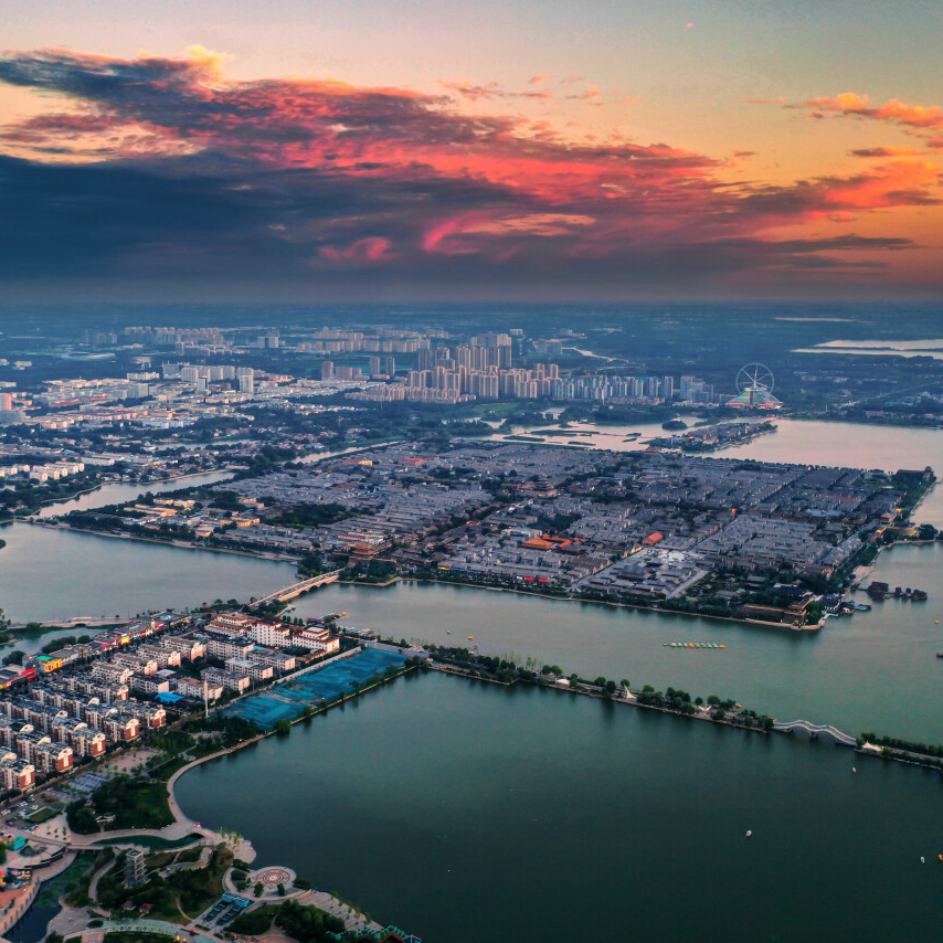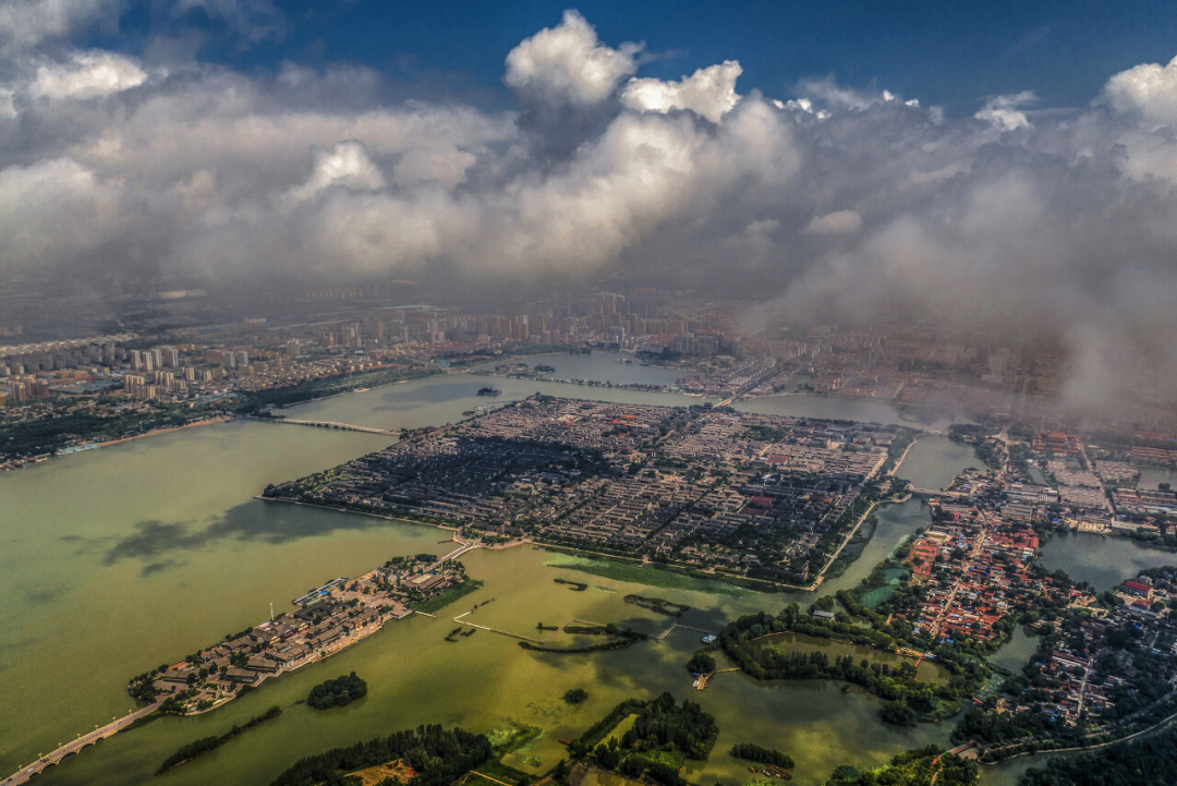 四四方方的“水上古城”被东昌湖温柔地环抱,湖面烟波浩渺,水汽氤氲,远处的高楼若隐若现,宛如水墨画 。