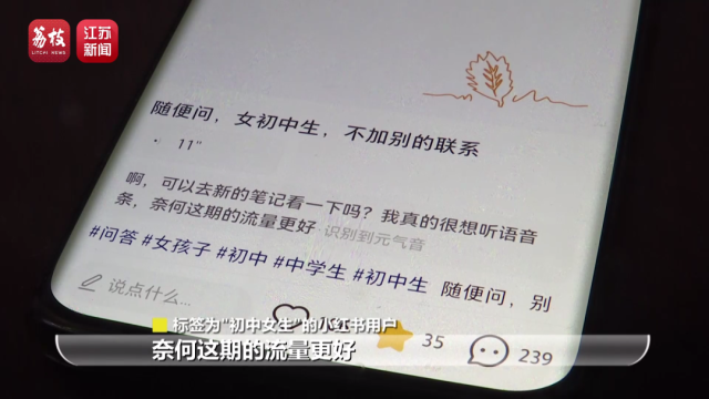 还有网友曝光称,一些成年人用户为了流量,使用未成年人的身份参与互动。记者观察发现,在一条标签是“初中女生”互动下,发帖人发布了一段引流的语音。根据语音分辨,更像是成年人。