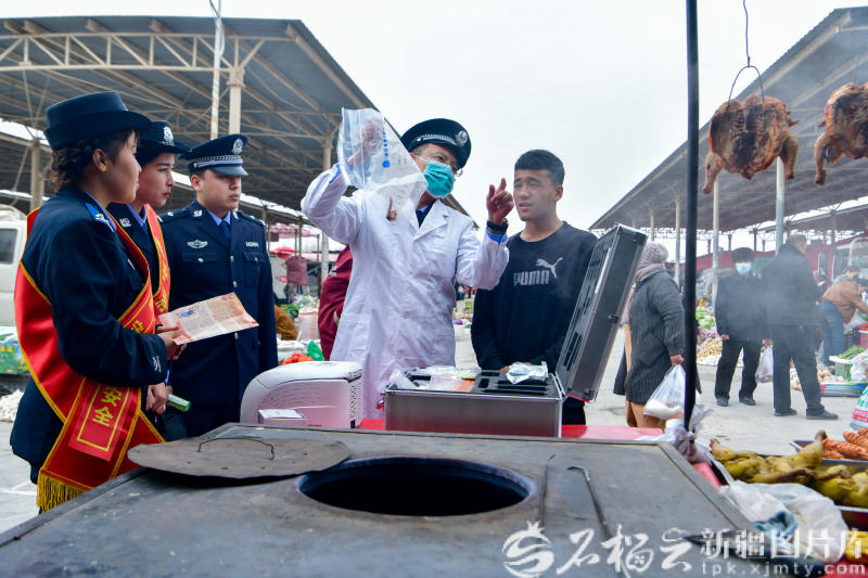 3月12日,新和县公安局环境资源和食品药品犯罪侦查大队在各巴扎、集市推出“你点我检”便民快检服务。流动服务点前,不少群众提着刚买的肉制品和蔬菜前来检测。现场还设置了假冒伪劣产品展示区和普法咨询台,民警围绕群众关心的热点,组织商户和群众现场研讨,共同学习法律法规。
