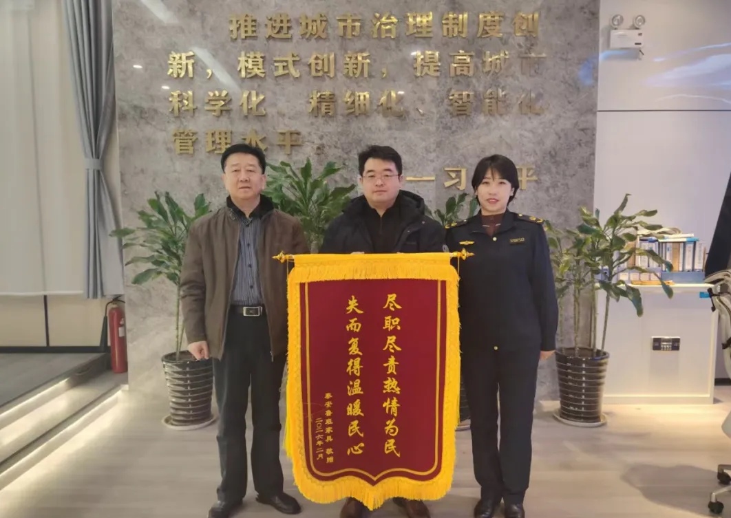 市民张先生驾驶货车途经长城路医学院东门时,车上所载沙发不慎掉落。工作人员第一时间调取监控,快速锁定掉落位置及车辆信息,经多方联动查找,成功将沙发找回。张先生激动地送来锦旗:“尽职尽责热情为民,失而复得温暖民心”,用朴实话语彰显执法队伍的责任担当与为民温度。