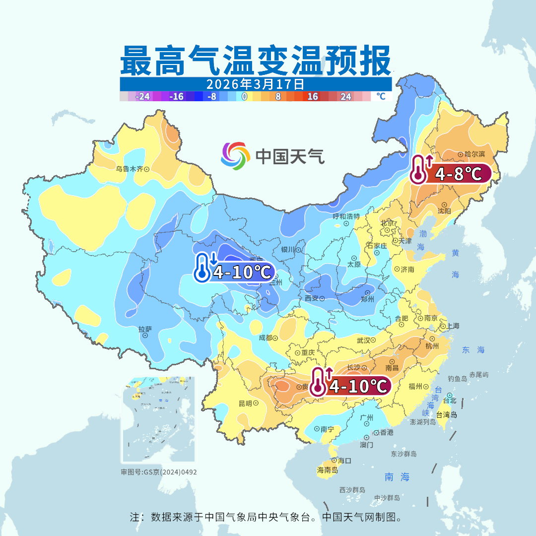 像是华北、东北地区,今后三天气温将总体偏高,华北最高气温多在15℃上下,东北多地最高气温会回升到10℃以上。18日,受冷空气影响,华东和东北地区还将短暂降温;19日至21日,气温又会回升至较常年同期偏高水平。
