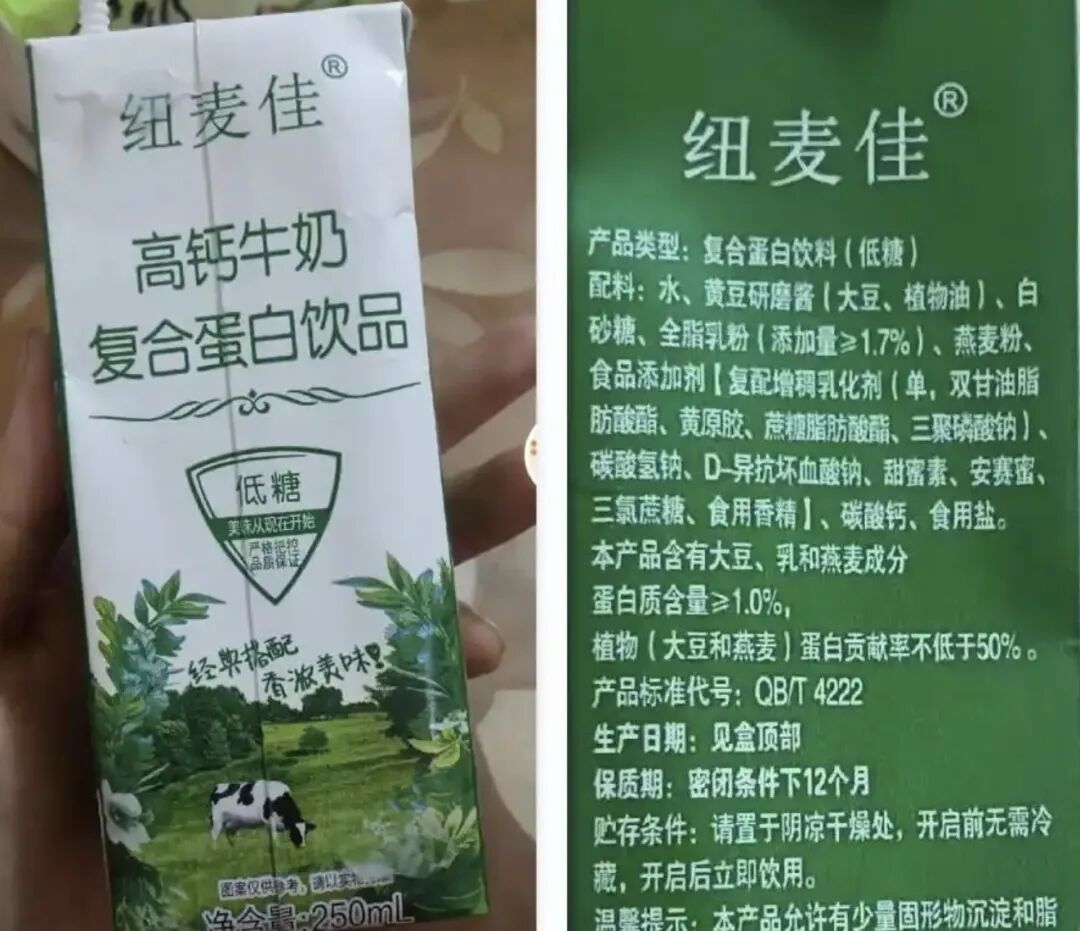 中国新闻网《民生调查局》记者在多地走访发现,一些产品在外包装上突出“高钙牛奶”“牧场”等字样,但实际产品类别却是复合蛋白饮品、含乳饮料等。还有部分产品在命名、包装风格上刻意贴近知名乳品品牌,容易让消费者对其真实属性产生误认。
