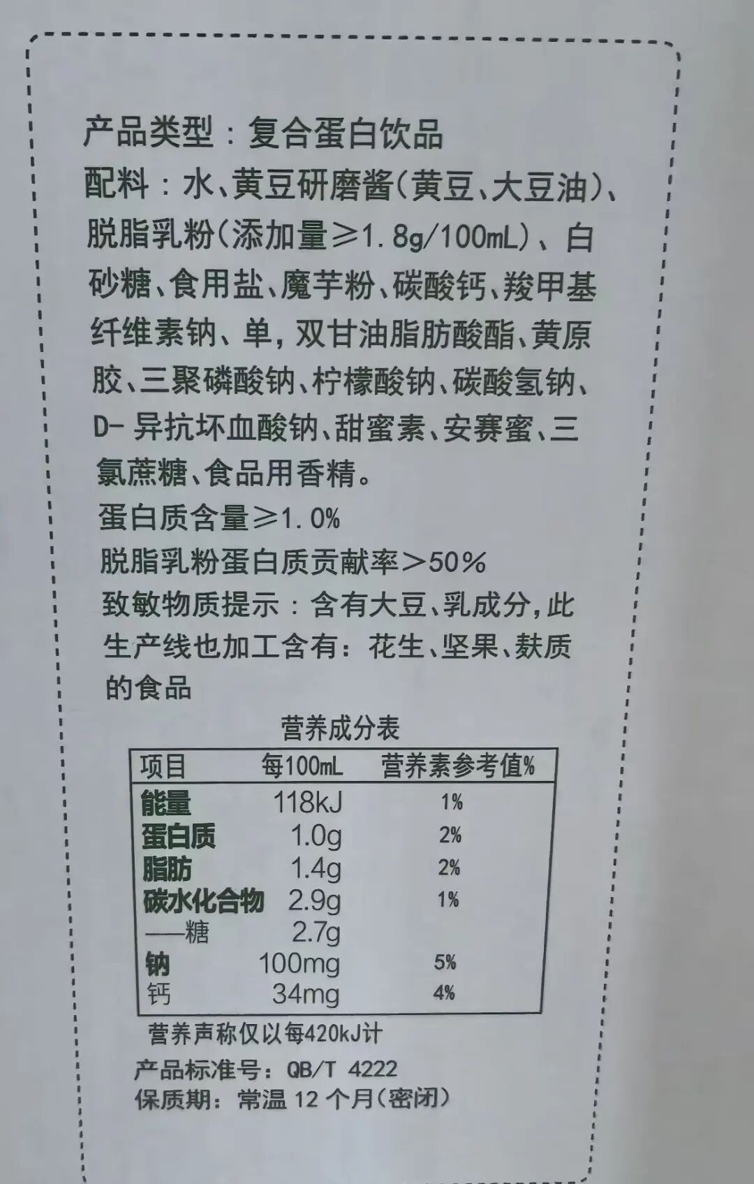 查看背面配料表发现,配料排序第一位是水,其次是黄豆研磨酱(黄豆、大豆油),脱脂乳粉标注着“添加量≥1.8g/100mL”,其后是白砂糖、食用盐,还有甜蜜素、安赛蜜等甜味剂。产品标准号为“QB/T4222”。