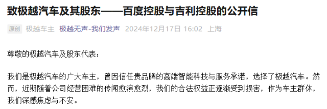 不过由于关键零配件缺货严重影响维修进度,车机软件bug频发严重威胁行车安全,极越车主在2025年曾发布致百度与吉利的联合公开信。